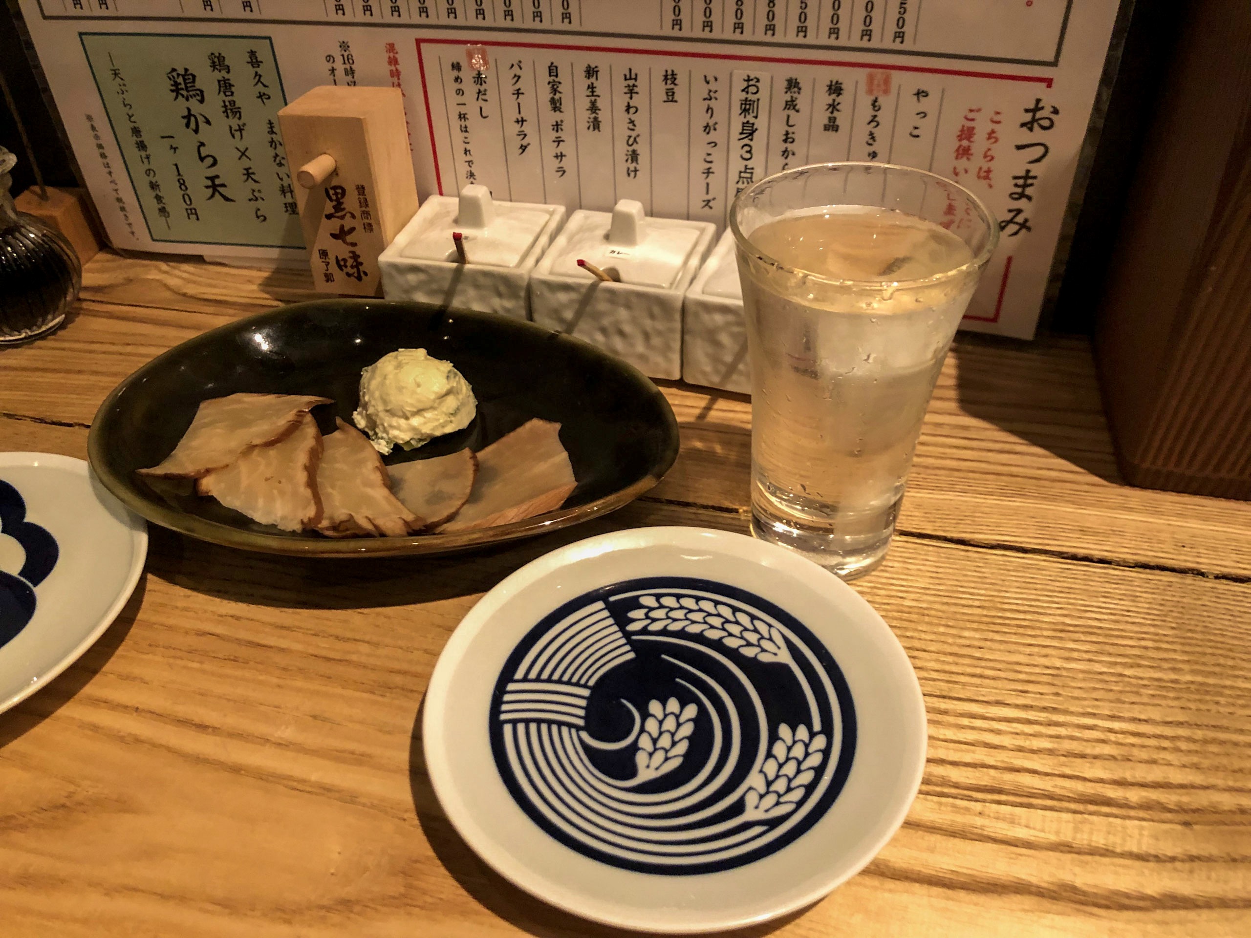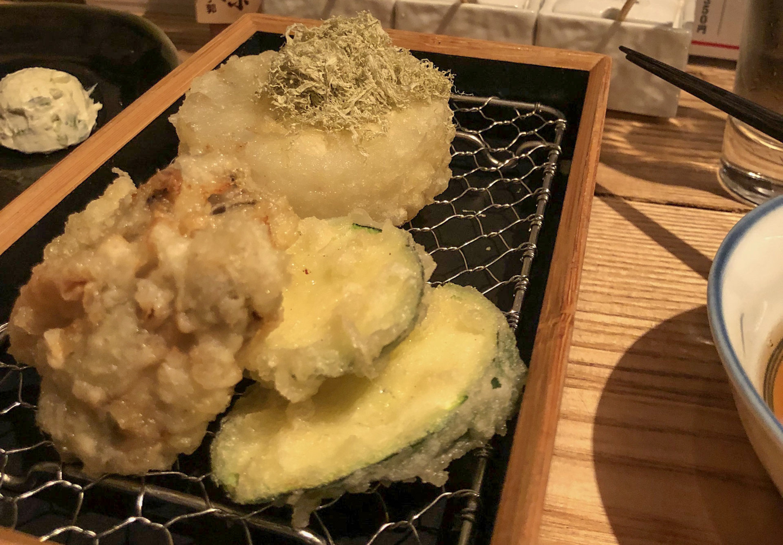 すぐに出てくる「おつまみ」メニューには、「いぶりがっこチーズ」や「熟成しおから」など日本酒のアテがたくさん。いぶりかっこをボリボリしながら日本酒を飲んでしばらくすると、揚げたての天ぷらがでてきます。