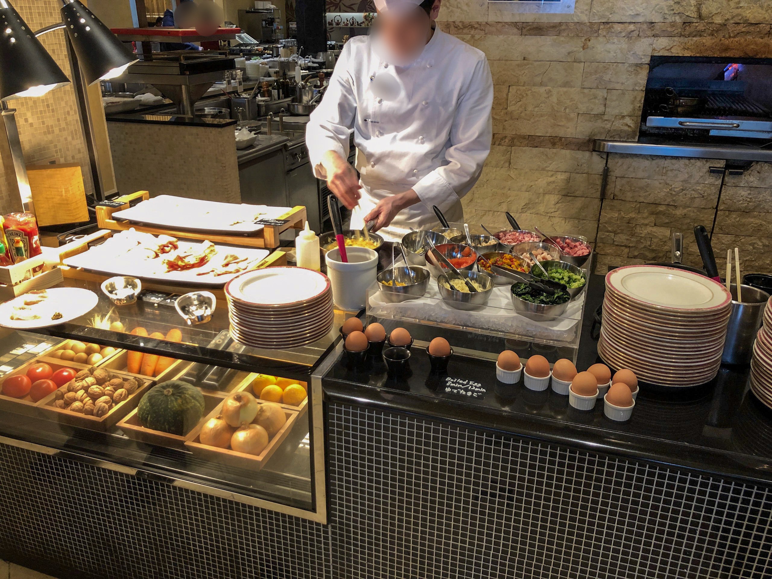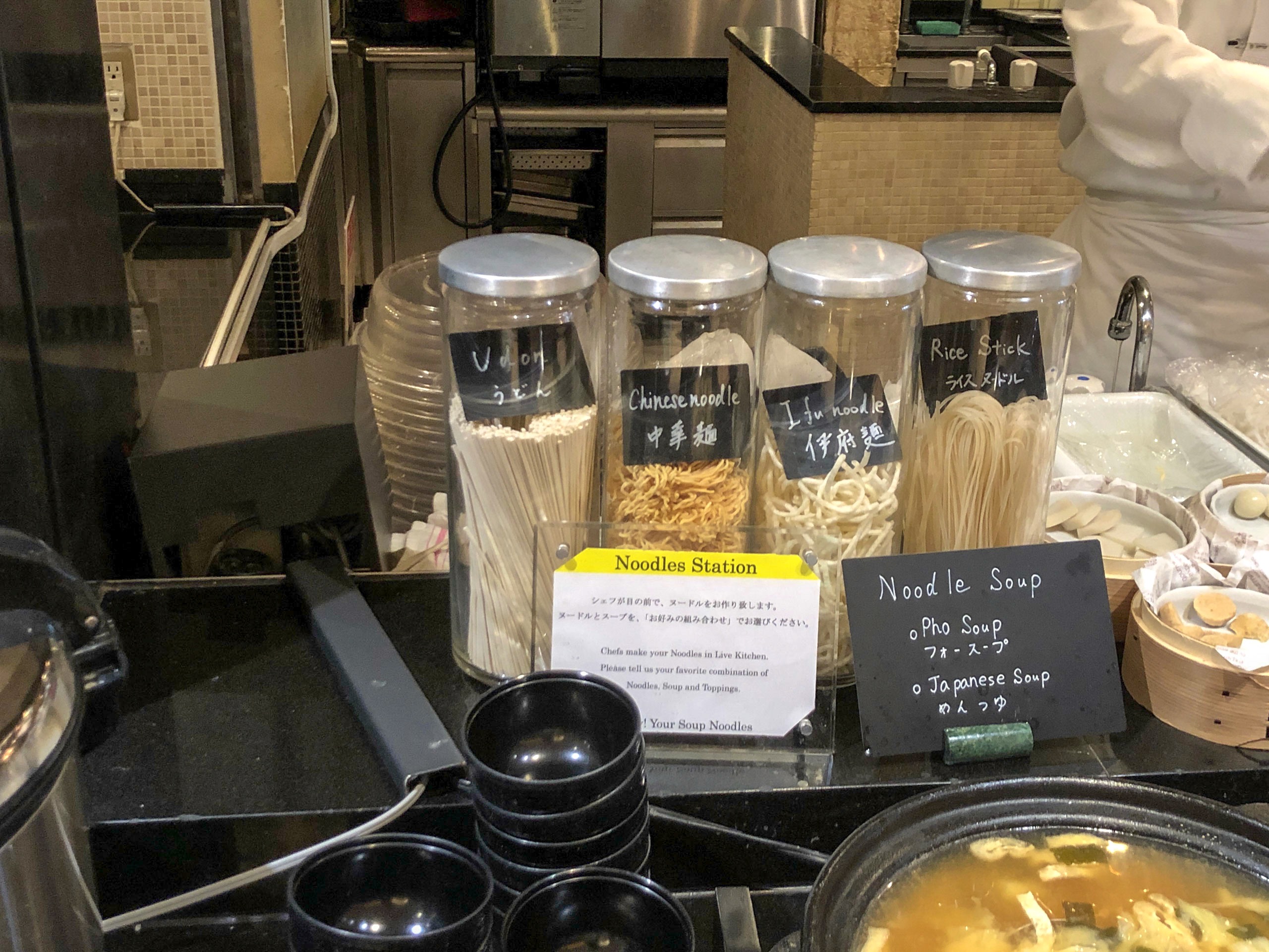 「ザ・テラス」の朝食は、和洋中の各種料理に加え、ホテル朝食の定番エッグステーションがあり、好みの具材・焼き方で卵料理を目の前で調理していただけます。また、「ヌードルバー」もあり、好みの麺・具材とスープ(めんつゆ or フォースープ)でミニヌードルを作っていただけます。飲んだ翌日の朝には最高です(笑)