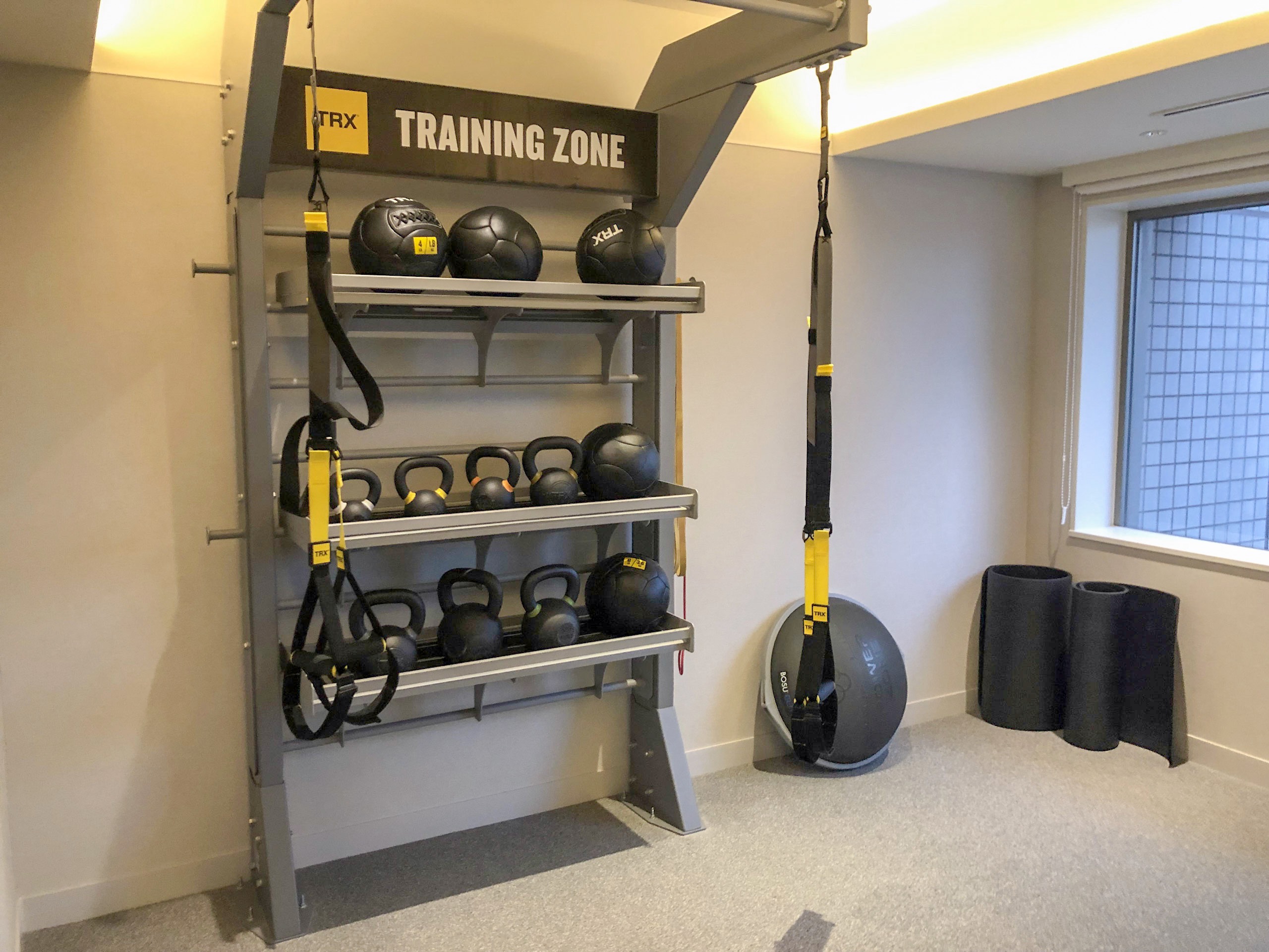 フィットネスは4階に設置されており、24時間利用することが可能です。トレッドミル(ランニングマシーン)4台、クロストレーナー(ウォーキングマシーン)が3台、ショルダープレスなどの筋トレマシーンが3台設置されています。また、バランスボールがあるミニスタジオ、ウェイトトレーニングができるエリアも用意されています。