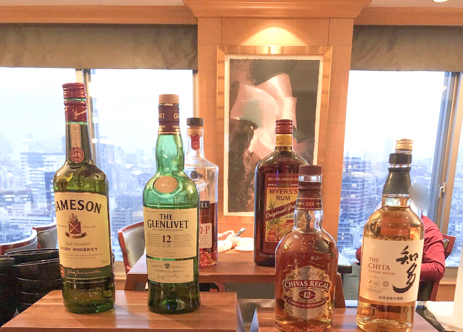 ここのラウンジのいいところは、なんと言ってもアルコール類、特にウィスキーの豊富さです。ワイン(赤・白・スパークリング)やビール(エビスとサッポロ)などのスタンダードなものはおさえつつ、ウィスキーは「シーバルリーガル12年」「THE GLENLIVET」「JAMESON」「知多」と4種類も用意されており、好みに合わせて選べます。また、ジン・ウォッカ・テキーラなども用意されているので、ジュースで割ってカクテルを楽しむこともできるようになっています。