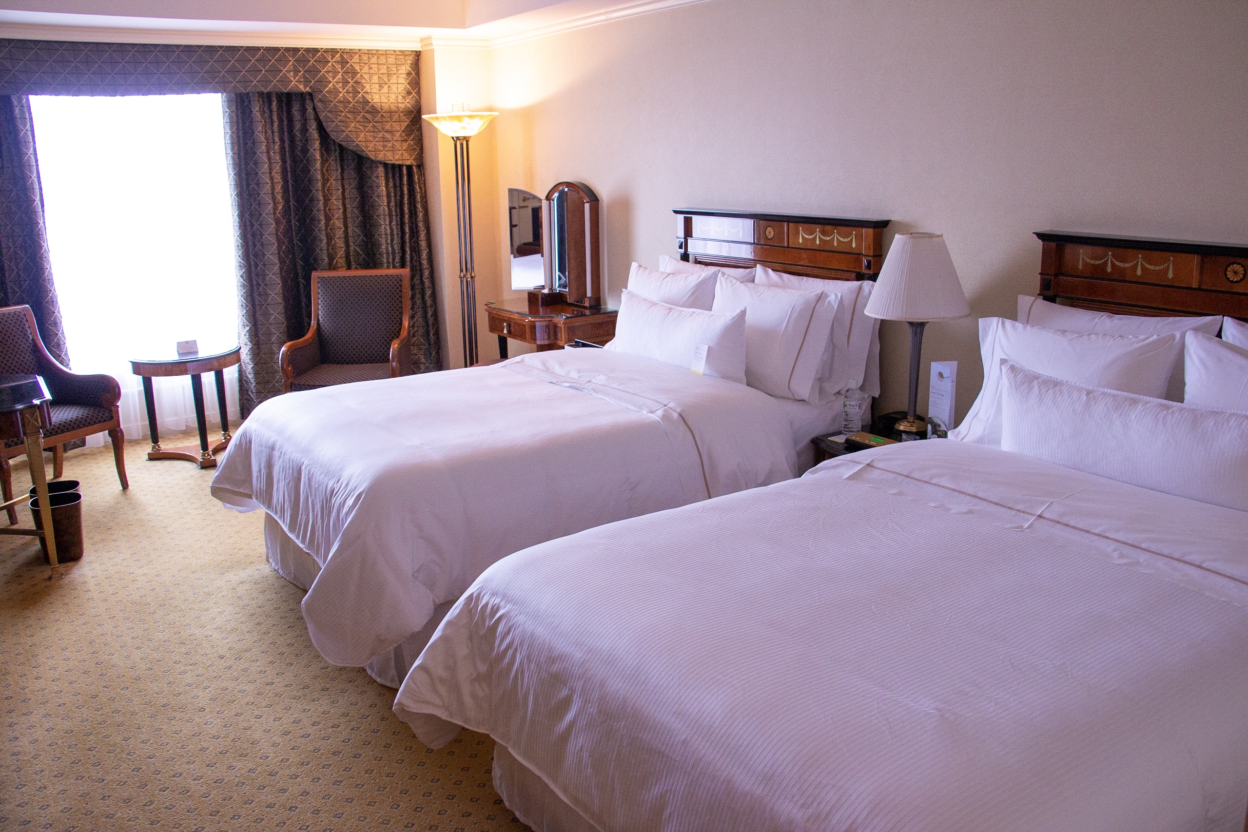 今回アサインされた部屋は18階の「デラックスルーム(ツイン)」でした。部屋の広さは42㎡と比較的大きく、ベッドのほか、オットマン付のソファー、書斎机などが余裕をもって配置されています。
